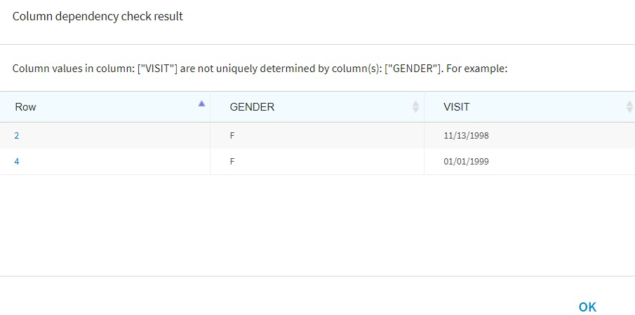 TIBCO Clarity uses the key/value pair to check the column dependency, that is, if a value in a column is uniquely decided by values in another column or other more columns.