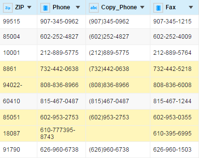 A new column Copy_Phone is created, and all the phone numbers are in the (999)999-9999 format.