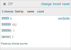 After applying pattern facet to the ZIP column, you can see that 49 rows are in the format of 9999. This format is a typo. To transform this format to the right 99999 format: