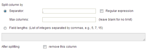 You can split a column by the number of characters contained in cell values. Numbers are separated by comma (,). You can use this function when the cell values do not contain any separator or a fixed separator.