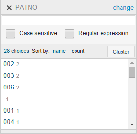 JavaScript must be enabled in order to use this site.Please enable JavaScript in your browser and refresh the page. Faceting to Check Duplications Use the data faceting function to check duplicates in a column. This example shows how to use the faceting function to check duplicates in the PATNO column. Procedure From the PATNO column menu, click Facet > Text Facet. In the PATNO facet panel, click count. In the PATNO column, the values 002, 003, and 006 have duplicates. Copyright © Cloud Software Group, Inc. All rights reserved.