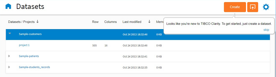 After launching TIBCO Clarity, the home page is displayed with three sample datasets.