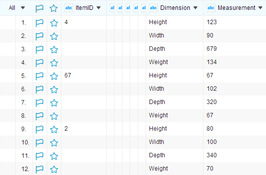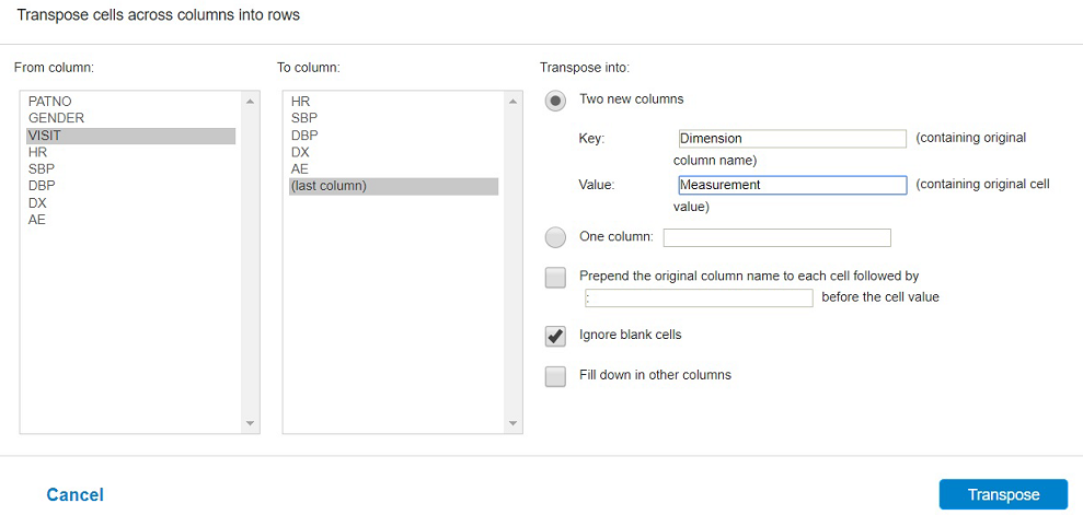 Suppose your project data has the Height, Width, Depth, and Weight columns, you can use this function to transpose these four columns into two columns: Dimension and Measurement.