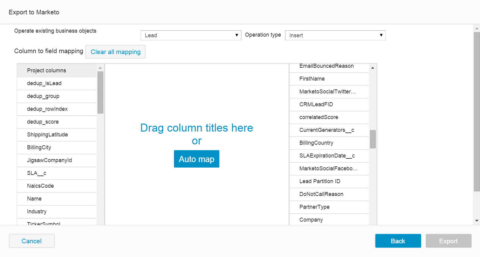 • For the insert opportunity operation, you must map the project Name column to the Marketo Name field.