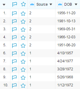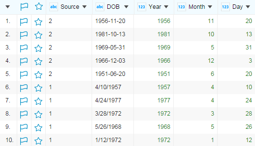 Now, you want to split the DOB column into three columns: Year, Month, and Day. When splitting, you have to do some reordering for the dates in Source 1.