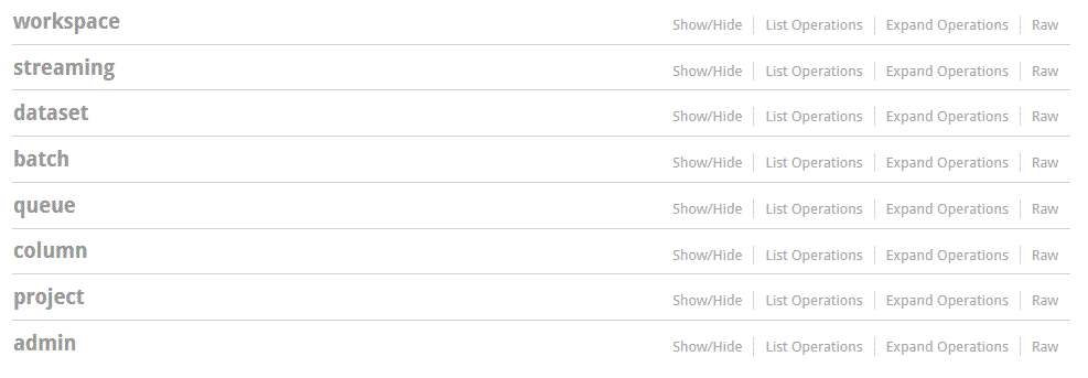 - The streaming group contains APIs used to manage streaming batch jobs, such as start a new streaming batch job, delete a streaming batch job, or query streaming batch jobs.