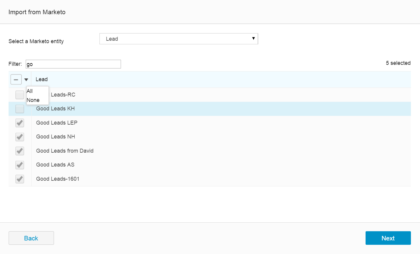 Select a Marketo entity list, select a Marketo entity that you want to import, and then click