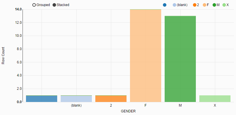 JavaScript must be enabled in order to use this site.Please enable JavaScript in your browser and refresh the page. Creating a Bar Chart to Check Invalid Data Create a bar chart to check invalid data. To create a bar chart to check invalid data in the GENDER column: Procedure On the toolbar, click Chart. In the Chart type area, click bar, and then configure the chart setting: From the X axis list, select GENDER. From the Y axis list, select Row Count. From the Group by list, select GENDER. Click Create chart. A bar chart is created. On the top of the chart, click stacked. Result A bar chart is created. The chart shows that the GENDER column has invalid values: (blank), 2, and X. Copyright © Cloud Software Group, Inc. All rights reserved.