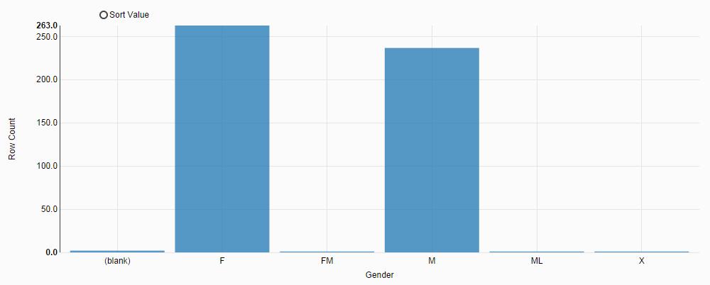 For example, create a bar chart for project 1 in the Sample-customers dataset to present distribution of gender values. To create a bar chart for the Gender column: