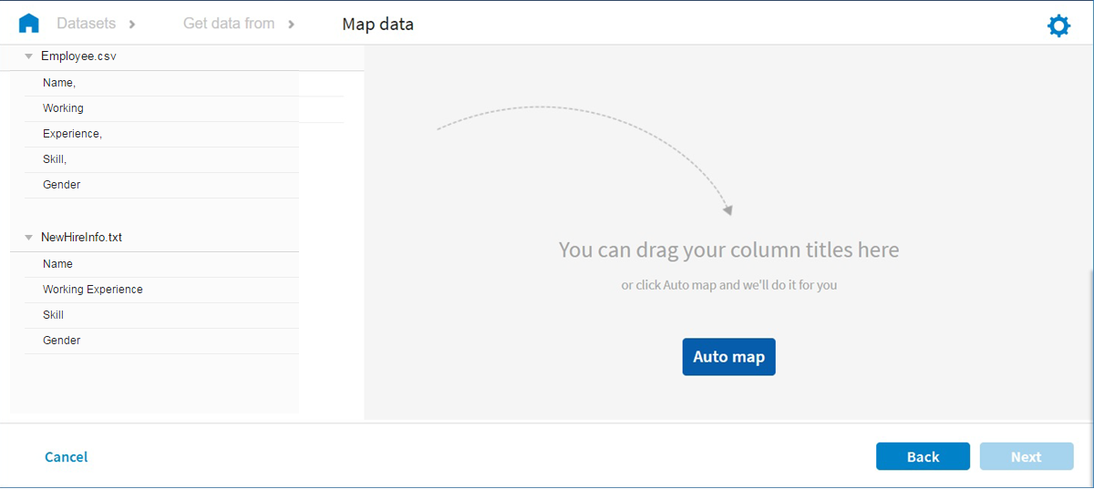 On the "Map data" page, drag a column from one source file to the right panel, and then drag the column that you want to map from another source file. A superset of column is displayed in the Group your data area.