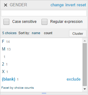 JavaScript must be enabled in order to use this site.Please enable JavaScript in your browser and refresh the page. Faceting to Check Invalid Values Use the data faceting function to check invalid values in a column. This example shows how to use the faceting function to check duplicates in the GENDER column. Procedure From the GENDER column menu, click Facet > Text Facet. In the GENDER facet panel, click count. The GENDER column has invalid values: 2, X, and (blank). Copyright © Cloud Software Group, Inc. All rights reserved.