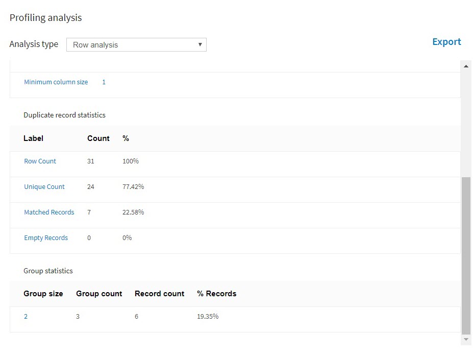 If you used the Dedup function on the data before you performing row analysis, there are two more tables in which the Dedup Profiling result is displayed. One of them lists information about row count, unique count, matched records, and empty records. The other table lists information about group size, group count, record count, and the percentage of the duplicate records.