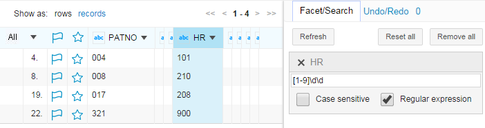 Take the HR column in project 1 of the Sample_patients dataset as an example. Suppose you want to search the heart rates of patients that are equal to or greater than 100, you can use a regular expression to achieve this.