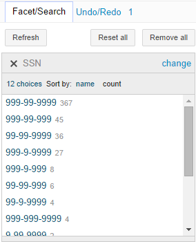 Apply pattern facet to the SSN column to filter out inconsistent data formats of social security number.