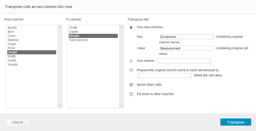 Suppose your project data has the Height, Width, Depth, and Weight columns, you can use this function to transpose these four columns into two columns: Dimension and Measurement.