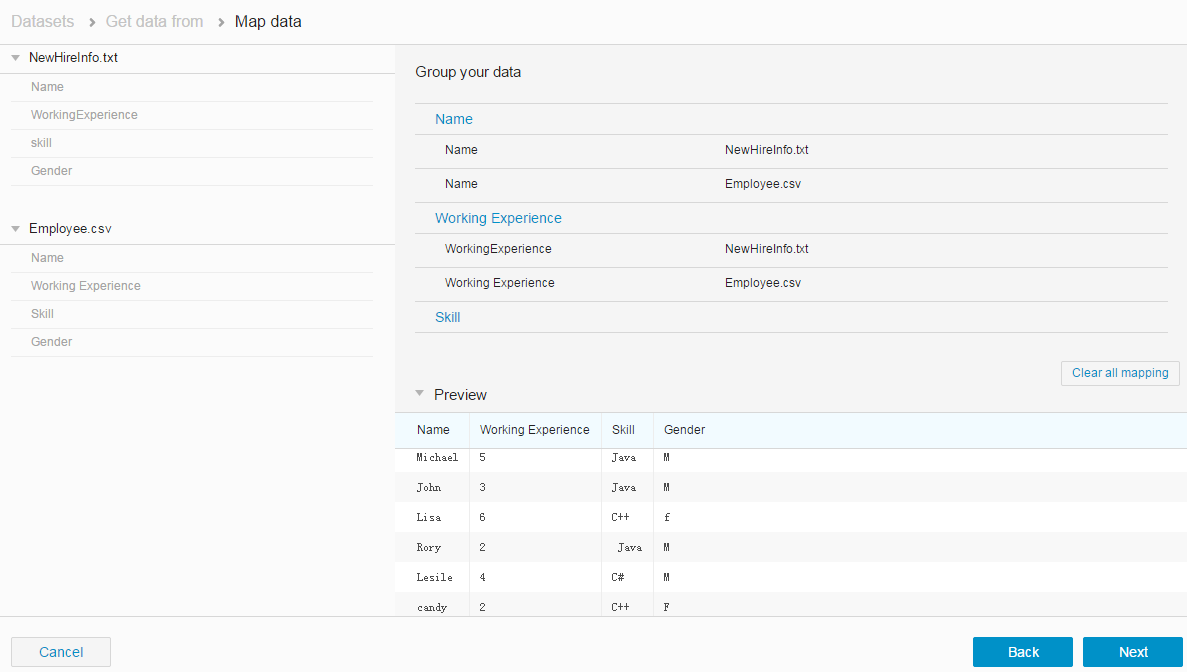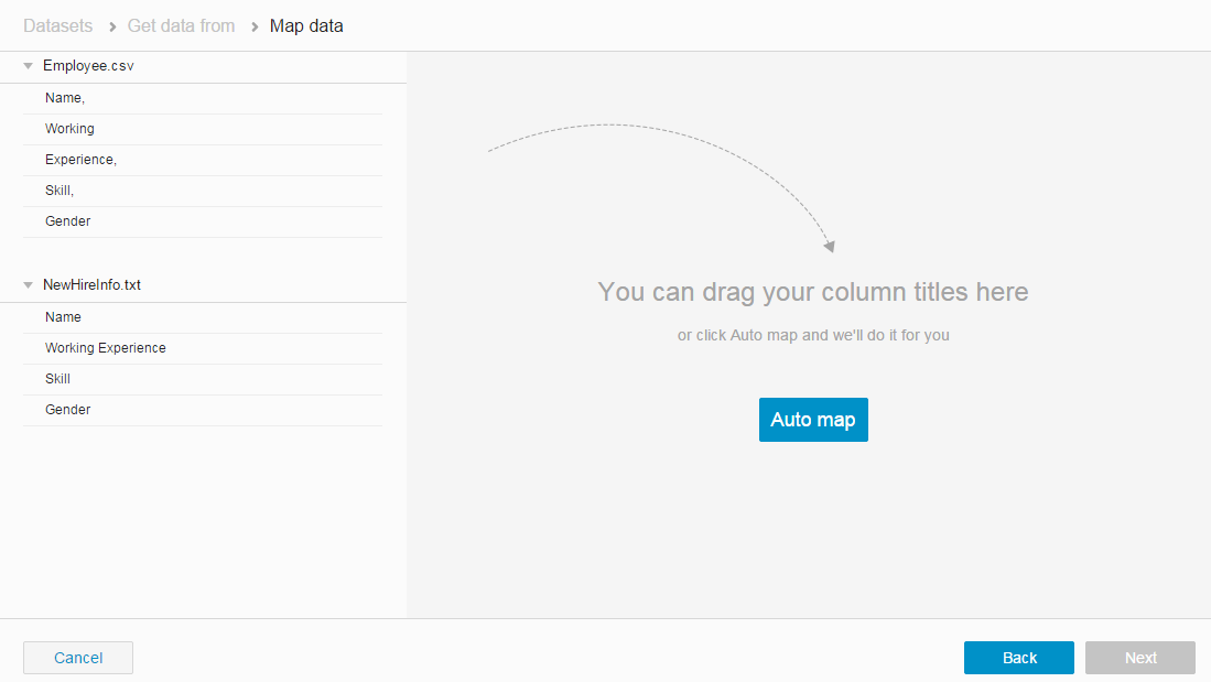 On the "Map data" page, drag a column from one source file to the right panel, and then drag the column that you want to map from another source file. A superset of column is displayed in the Group your data area.