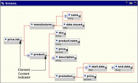 By defining content models, a structure for the document is established. This structure can be thought of as a tree where the “root” is the encompassing element and its branches are the elements and attributes that may be contained within it (as defined by the content model). In turn each branch may have branches defined by their content model. The diagram at the top of the elements/ types panel provides a graphical view of these relationships. Explore the content model by clicking on the elements to expand and collapse their content. (Specifically click on the Element Content Indicator icon, labeled in Figure 41.) Only elements that define a content model can be expanded. Within the diagram, double clicking on the root element, in this case price.list, will produce a graphical view of the entire schema.Figure 41 Graphical View of the SchemaYou have completed the exercise. This tutorial introduced the basic steps required to create an XML Schema. Exercise 2: Defining and Deriving Complex and Simple Types will teach you how to create and use your own complex and simple types.To learn how to build a sample XML document based on the schema you have just built, see XML Instance Exercise.