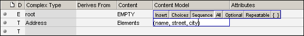 5. Tab to the adjacent empty field in the second column, and type in Address as the name of the complex type. Tab to the “Derives From” column. Notice that the second column's heading has changed from “Element” to “Complex Type”.