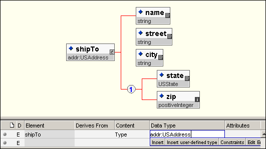 2. For further practice, define a simple type (data type) called UKPostcode and assign it to the postcode element. The new simple type can be an extension or restriction of an existing simple type. For example, to be very precise, you could restrict a string by specifying a regular expression (pattern) that the type must match.The address types created in this schema could later be applied to elements. For example, shipTo and billTo elements could be added to this schema and be declared as having the type USAddress. These type definitions could also be used in other schemas. As a final exercise, create a new schema resource and import the address schema namespace you created in this tutorial. The easiest way to import a namespace is to use the Add Namespace option of the overview panel, which enables you to browse and select another schema from your project. Once the address schema created in this exercise has been imported, create a shipTo of type USAddress. To references an element, attribute or type existing in another namespace, use the prefix for the external namespace followed by a colon and the component name. Figure 48 shows a new schema referencing the USAddress type created in this schema.