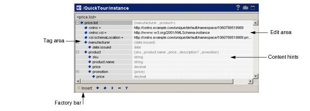 The factory bar, illustrated in Figure 94 above, is one way you can insert additional elements or attributes into your document; you can also double-click on an element within the tag area and use the drop-down window that appears to add components to your document. Figure 95 depicts the document-building options.Figure 95 Document-Building Options