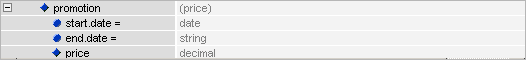 2. Select promotion within the tag area, and use the factory bar to add the start.date and end.date attributes.Figure 97 Adding Element
