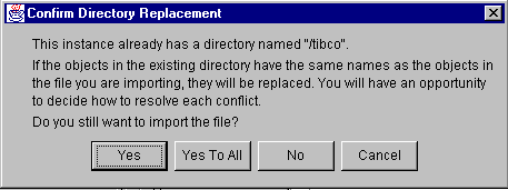 3. Select an XML file that had previously been exported from a repository, either using TIBCO Designer or using the RepoExport command-line utility.Figure 118 Confirm Directory Replacement Dialog Box