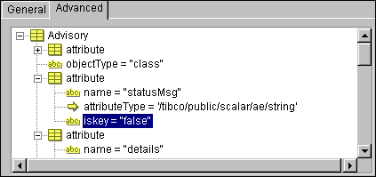 3. Click the Advanced tab in the configuration panel.Figure 120 Advanced TabTIBCO Designer displays the object and its attributes. Attributes usually have names, attribute types, and other properties. The value of each attribute is either a string or a global name. In the example above, the attribute with the name statusMsg has an attributeType that is a global name.