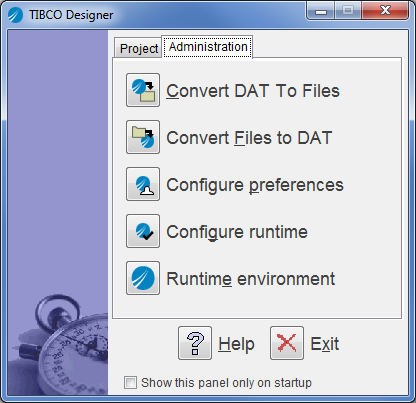 When you start TIBCO Designer, the startup panel allows you to open projects (see Startup Options). You can also use the startup panel to perform some TIBCO Designer administrative tasks. When you choose the Administration tab, the panel presents the choices shown in Figure 2:Figure 2 Startup Panel Administration Options