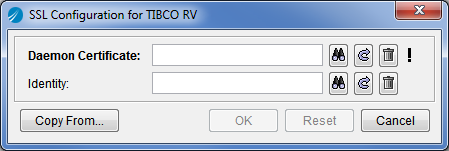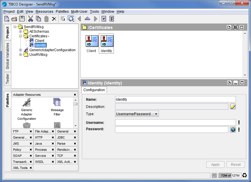 6. The following diagram shows a certificate and identity resource added to a project. The certificate and identity resource can be attached to a TIBCO Rendezvous or JMS session. See TIBCO Rendezvous SSL Configuration and JMS SSL Configuration for details.