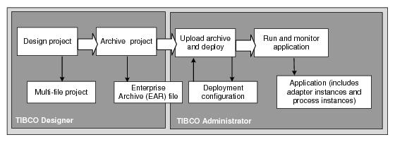 Figure 45 TIBCO Application Flow of InformationAn EAR file can contain local project resources, design-time library resources, and files as specified in AliasLibrary resources. In addition, the TIBCO Designer classpath may include references to other files that are included in the EAR file. The EAR file size may become an issue when you build it in TIBCO Designer, load it into TIBCO Administrator and deploy it to remote machines.An EAR file should only include resources that are required to deploy the project. Large archive files have negative impacts at deployment. If each application in you project uses different resources, different AliasLibrary resources should be used to support it (rather than one large AliasLibrary).