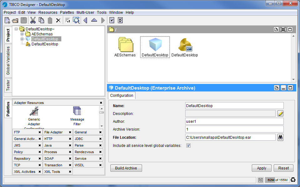 4. If you wish to build the archive now, you can do so by clicking the Build Archive button. When you click the button, TIBCO Designer creates an enterprise archive (.ear) file that you can then deploy from TIBCO Administrator.