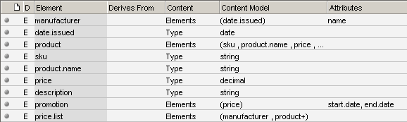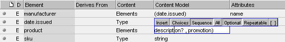 2. Enter manufacturer, product+ as the content model. (The plus sign designates the productelement as required and repeatable.) Tab out of the field to update the schema.