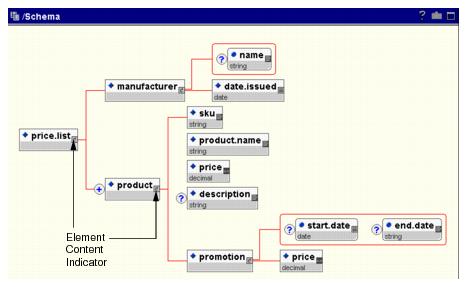 By defining content models, a structure for the document is established. This structure can be thought of as a tree where the “root” is the encompassing element and its branches are the elements and attributes that may be contained within it (as defined by the content model). In turn each branch may have branches defined by their content model. The diagram at the top of the elements/ types panel provides a graphical view of these relationships. Explore the content model by clicking on the elements to expand and collapse their content. (Specifically click on the Element Content Indicator icon, labeled in Figure 21.) Only elements that define a content model can be expanded. Within the diagram, double clicking on the root element, in this case price.list, will produce a graphical view of the entire schema.Figure 21 Graphical view of the schemaCongratulations! You have completed the exercise. This tutorial introduced the basic steps required to create an XML Schema. Exercise 2: Defining and Deriving Complex and Simple Types will teach you how to create and use your own complex and simple types.To learn how to build a sample XML document based on the schema you have just built, see XML Instance Exercise.