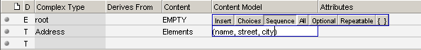 6. Later in this exercise you'll use the “Derives From” column to extend the Address complex type. For now, however, we can bypass this field, and tab to the Content field. The content will default to “Elements”, which is the desired content. (Other content types could be selected by way of the menu presented by clicking the Content Type button.)