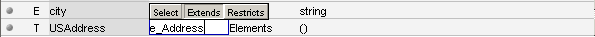 4. Tab to the Derives From column and click Extends. Next, click Select and select Address. Notice that the column heading changes to “Extends”.Notice also that your selection is inserted in the column with the prefix “e_”. This indicates that the type USAddress is being derived from the base type Address by extension. If you derive from a base type by restriction, you'll see the prefix “r_”.