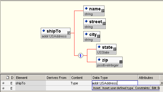 2. For further practice, define a simple type (data type) called UKPostcode and assign it to the postcode element. The new simple type can be an extension or restriction of an existing simple type. For example, to be very precise, you could restrict a string by specifying a regular expression (pattern) that the type must match.The address types created in this schema could later be applied to elements. For example, shipTo and billTo elements could be added to this schema and be declared as having the type USAddress. These type definitions could also be used in other schemas. As a final exercise, create a new schema resource and import the address schema namespace you created in this tutorial. The easiest way to import a namespace is to use the Add Namespace option of the overview panel, which enables you to browse and select another schema from your project. Once the address schema created in this exercise has been imported, create a shipTo of type USAddress. To references an element, attribute or type existing in another namespace, use the prefix for the external namespace followed by a colon and the component name. Figure 22 shows a new schema referencing the USAddress type created in this schema.