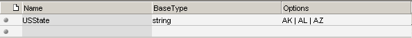 3. Tab to the Options column. To define a list of possible values for USState, click the Edit Enums button. The properties panel appears in the lower left of the application window with the Enumeration tab active. In the text box at the top of this tab, enter the value 'AK' (without quotes) and then click Add. Follow the same procedure for the values 'AL' and 'AR'. (Of course, there are more postal abbreviations, but let’s stop here.)