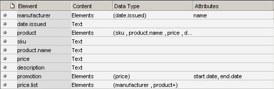 18. Enter manufacturer, product+ as the content model. (The plus sign designates the product element as required and repeatable.) Tab out of the field to update the schema.