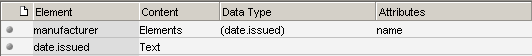 10. Type date.issued into the Content Model column to restrict the contents of manufacturer to one and only one date.issued element. Since name is an attribute, it does not need to be within the manufacturer element.