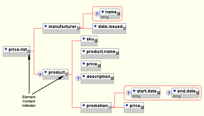 By defining content models, a structure for the document is established. This structure can be thought of as a tree where the root is the encompassing element and its branches are the elements and attributes that may be contained within it (as defined by the content model). In turn each branch may have branches defined by their content model. The diagram at the top of the element panel provides a graphical view of these relationships. Explore the content model by clicking on the elements to expand and collapse their content. (Specifically, click on the Element Content Indicator icon, labeled in Figure 36.) Note that only elements that define a content model can be expanded. Within the diagram, double clicking on the root element, in this case price.list, will produce a graphical view of the entire schema, shown in Figure 36.Figure 36 Graphical view of the schemaCongratulations! You have completed the DTD Quick Tour. Notice that the elements and attributes were not constrained by data typing beyond text, because types such as integer, decimal and date are not available in a DTD. To see how these types could be implemented in a price list schema, see XML Schema Exercises