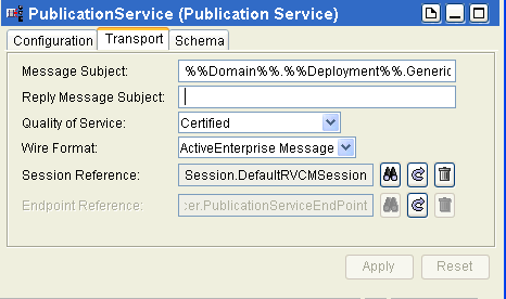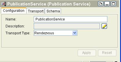 4. To provide some additional information about the transport, click the Transport tab. What is displayed depends on the transport type you selected for the service. The screen shot below shows the options available for the default transport, a TIBCO Rendezvous Certified transport. See Services Reference for detailed information on the individual services and different Transport tab content.
