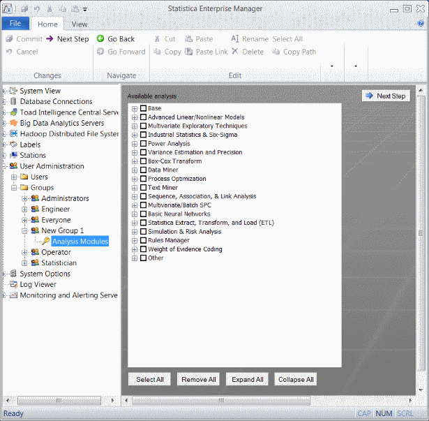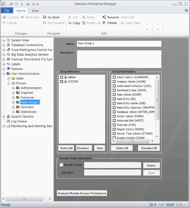 Click the Analysis Module Access Permissions button located at the bottom of the properties page to configure the Statistica analytics to which the group may have access.