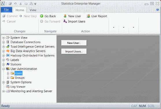 Select the Users node in the tree view. Two options are presented in the properties page, New User and Import Users, respective to the two types of user accounts described at the beginning of this example.