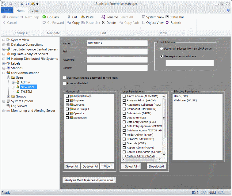 System Administration (SADM) or User Administrator (UADM) permissions are required to configure Users and Groups. For an overview of Statistica Enterprise permissions, see Permissions.