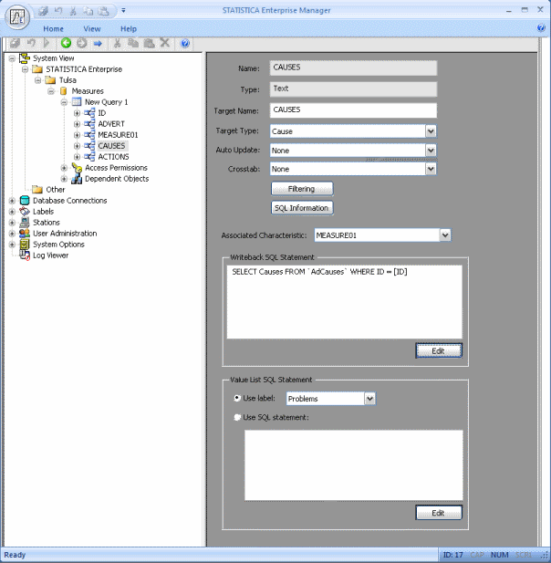 Now we have specified the SQL statement that will be used to write back to the AdCauses table whatever causes are selected by the user for out-of-control points.