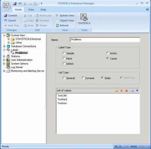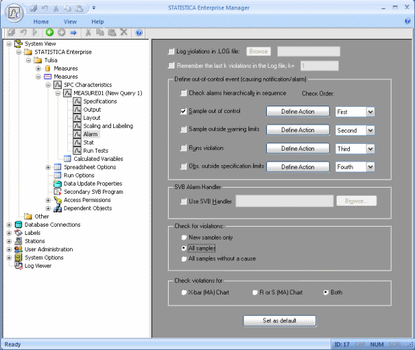 Sometimes when a quality control chart is displayed with out-of-control points, users want to be able to enter a cause and an action for each out-of-control point. STATISTICA Enterprise Data Configurations and Analysis Configurations can be configured to prompt users for causes and actions for out-of-control points. Those causes and actions will then be displayed in the chart next to their respective out-of-control points. In addition, those causes and actions will be written back to a database so that they will be displayed the next time that same quality control chart is run.