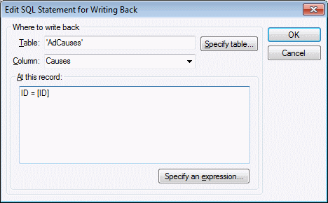 Click the Specify table button, and select AdCauses. Set Column = Causes.