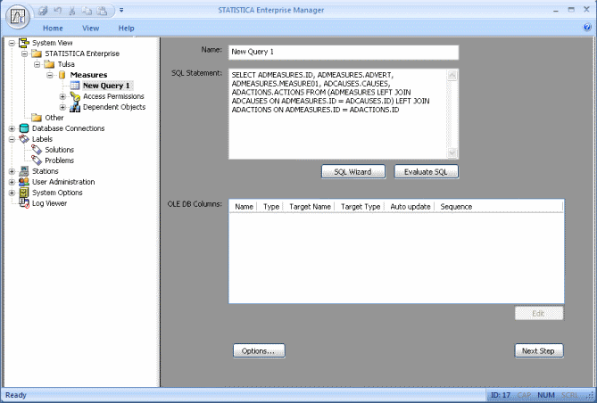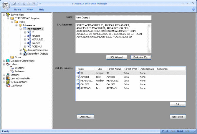Click Evaluate SQL, and expand the New Query 1 node in the tree view of Enterprise Manager.