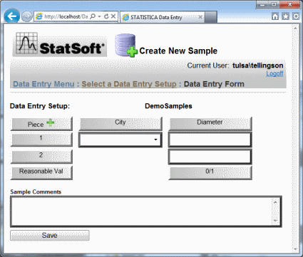 When we log on to the Web Data Entry site via the web and select the Data Entry Setup just created, we will see that the Label and Characteristic objects we specified in the Inputs node are now available for data input in the web UI.