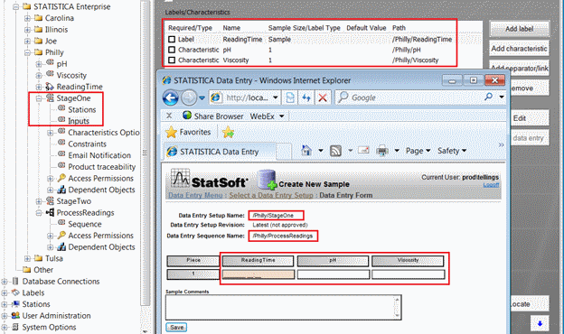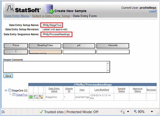 When the Data Entry Sequence is selected in the web UI, the data entry fields are displayed for StageOne, (the first Data Entry Setup object in the Data Entry Sequence).